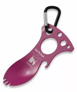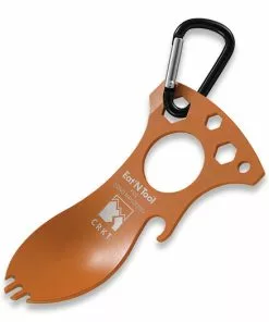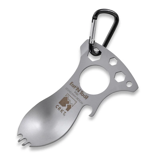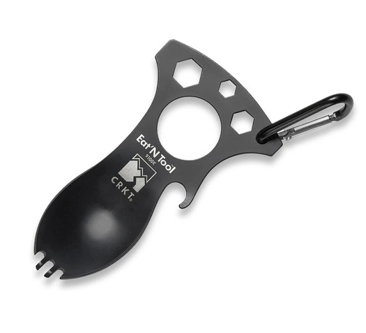 Eat’N Tool have ergonomic spoon, and a short-tuned fork. But in addition, there’s a handy bottle opener on one side. The right side of the handle is ground to provide an emergency screwdriver blade, which will also work as a pry for opening canisters.