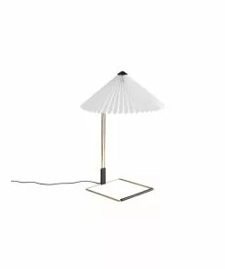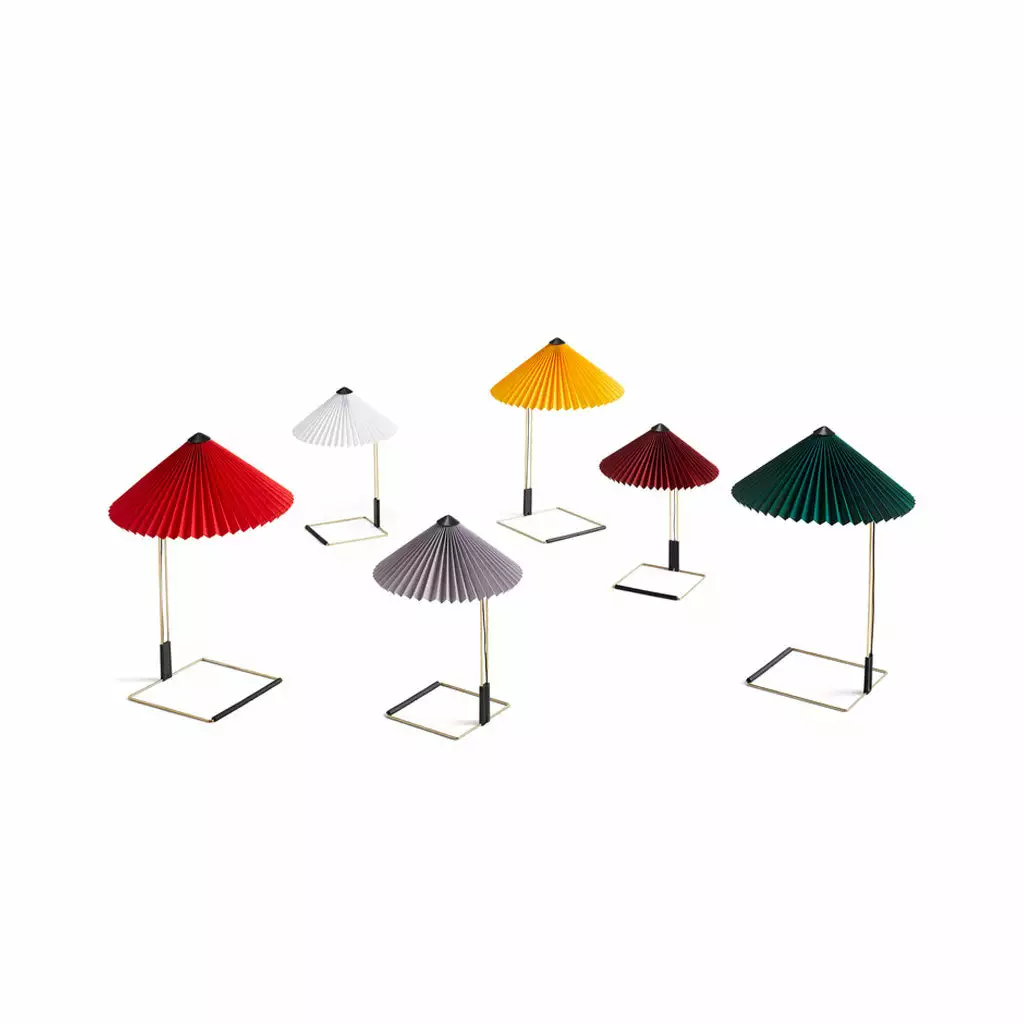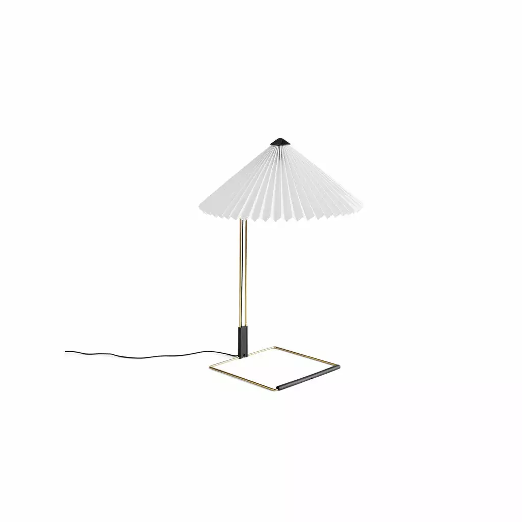 The Matin table lamp by Inga Sempé offers a contemporary yet poetic design, with a construction that combines visual delicacy with physical robustness. It consists of a steel wire bent frame finished in polished brass with matte black hardware, and is paired with a pleated cotton shade in a variety of vibrant colours. The light source is an integrated LED, offering a diffused downlight which is accompanied by a digital in-line dimmer control to adjust the output of light if required.