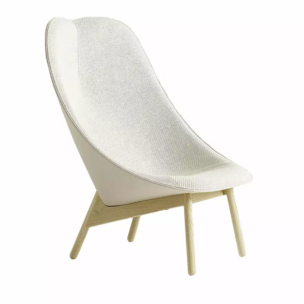 Uchiwa, designed by Doshi Levien for HAY is a capacious armchair taking its soft and open shape from the traditional Japanese hand fan. Generous and inviting, Uchiwa’s hard plastic shell has surprisingly soft down padding inside. New and familiar at once, the armchair comes in two upholstered versions: in soft down for a more domestic environment and in moulded foam for a more demanding contract context. The dramatic seat shell can be exposed or upholstered, and the legs come in natural or stained oak. The chair has an accompanying foot stool as a natural extension of its comfort.