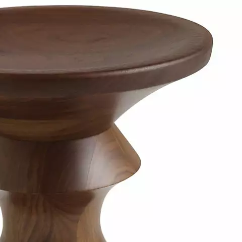 The Eames Walnut Stool (1960) was originally designed for the lobby and executive suites of the Time-Life Building at Rockefeller Center in New York City. Ray took the lead on design, drawing on her sculpture training. Working with blocks of solid walnut, the Eameses used a lathe to sculpt pleasing profiles, similarly to how one would be used to make turned legs for chairs and tables. After experimenting with several ideas, the duo chose three shapes for the Time-Life lobby to accompany the Eames Executive Chair and large murals by Josef Albers and Fritz Glarner. Crafting each for use as a table or seat – finding just the right curve for the top was crucial to its success – the Eameses were so fond of the design that they used it throughout their Pacific Palisades home. This is the authentic Eames Walnut Stool by Herman Miller. Made in U.S.A.