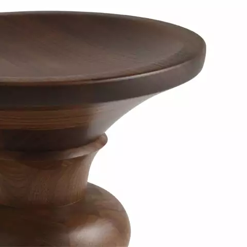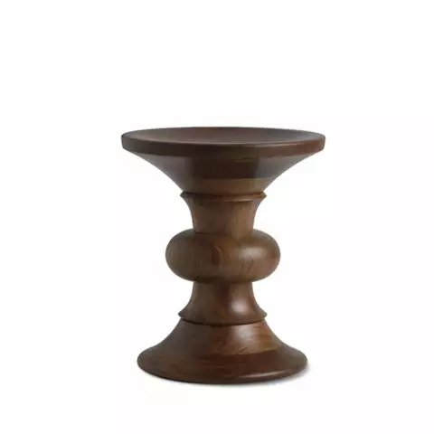The Eames Walnut Stool (1960) was originally designed for the lobby and executive suites of the Time-Life Building at Rockefeller Center in New York City. Ray took the lead on design, drawing on her sculpture training. Working with blocks of solid walnut, the Eameses used a lathe to sculpt pleasing profiles, similarly to how one would be used to make turned legs for chairs and tables. After experimenting with several ideas, the duo chose three shapes for the Time-Life lobby to accompany the Eames Executive Chair and large murals by Josef Albers and Fritz Glarner. Crafting each for use as a table or seat – finding just the right curve for the top was crucial to its success – the Eameses were so fond of the design that they used it throughout their Pacific Palisades home. This is the authentic Eames Walnut Stool by Herman Miller. Made in U.S.A.