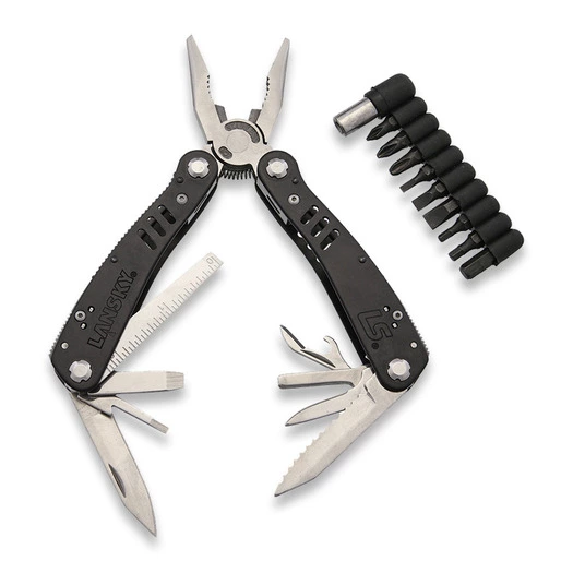 105 mm closed. All stainless construction. Features needlenose pliers with wire cutters, standard and serrated edge blades, small and medium screwdrivers, file/ruler, awl, magnetic bit holder, can/bottle opener, 9 assorted bits with bit driver, and black nylon belt sheath.