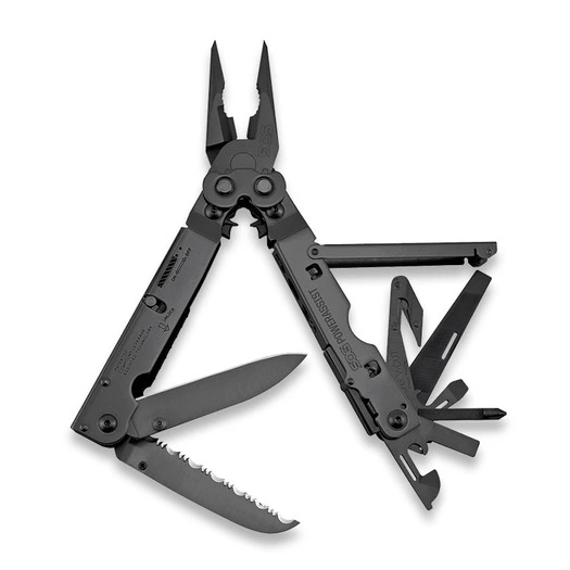 All stainless construction with black finish. Features one-handed flip opening and gear driven compound leverage for double the plier power. Standard and serrated edge S.A.T. assisted opening blades. Blades lock closed using patent pending side release mechanism. Components are now available that individually lock open with the patent pending Piano-Locks. Other components include needlenose pliers with wire cutters, three sided file, large screwdriver, Phillips screwdriver, can opener with small screwdriver, bottle opener with medium screwdriver, wire crimper, blast cap crimper and V-Cutter. Handles feature standard and metric measurement. Nylon belt sheath.